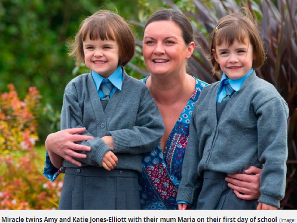 Vào đầu tuần này, hai cô bé song sinh vừa nắm tay nhau vừa cưới khúc khích đến trường. Đấy là những ngày đầu tiên Amy và Katie vào lớp 1. Khoảnh khắc này thực sự là điều kỳ diệu với mẹ của hai bé cô Maria Jones-Elliott, theo