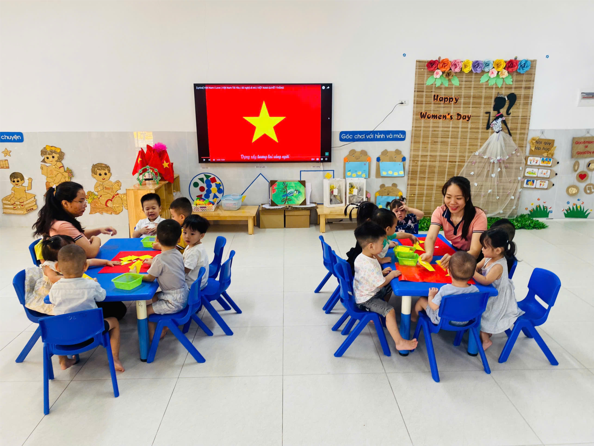 đã tổ chức hoạt động tạo hình dán lá cờ Tổ Quốc. Thông qua hoạt động này, trẻ biết lá cờ Tổ Quốc có màu đỏ, có ngôi sao 5 cánh màu vàng ở giữa, đó là lá cờ của Tổ Quốc Việt Nam; giúp trẻ phát huy khả năng sáng tạo, biết yêu thích cái đẹp, đồng thời giáo dục trẻ yêu lá cờ Tổ Quốc, yêu đất nước Việt Nam.