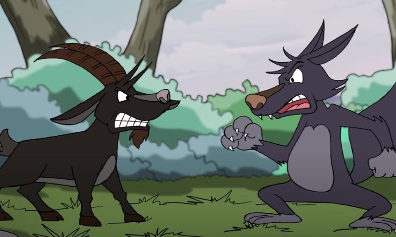 Dê đen cũng đi tới khu rừng để ăn cỏ non và uống nước suối. Đang tha thẩn gặm cỏ, chợt Sói xuất hiện, nó quát hỏi: