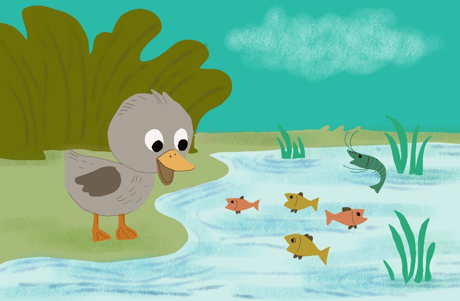 Cuối cùng chú đến một cái ao có rất nhiều tôm cá. Đứng trên bờ nhìn xuống, chú thấy từng đàn cá, tôm bơi lội tung tăng dưới nước, thỉnh thoảng một con tôm cong mình nhảy tanh tách.
