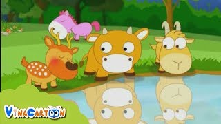 Chợt Hươu nhìn bóng mình trong dòng nước trong xanh và mỉm cười, chà hai bạn kia trông có giống mình đâu nhỉ? Họ có sừng và bốn chân, họ vẫn không phải là Hươu”.