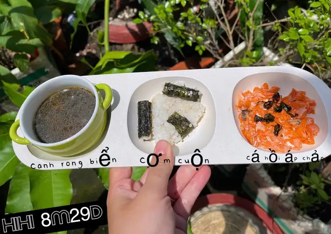 Cá hồi cũng có thể chế biến thành nhiều món ruốc giúp bé ăn dặm cùng với cháo. Phần ruốc cá hồi được tẩm ướp gia vị, thêm chút sả gừng, sợi ruốc bông, mềm mà không ngấy.