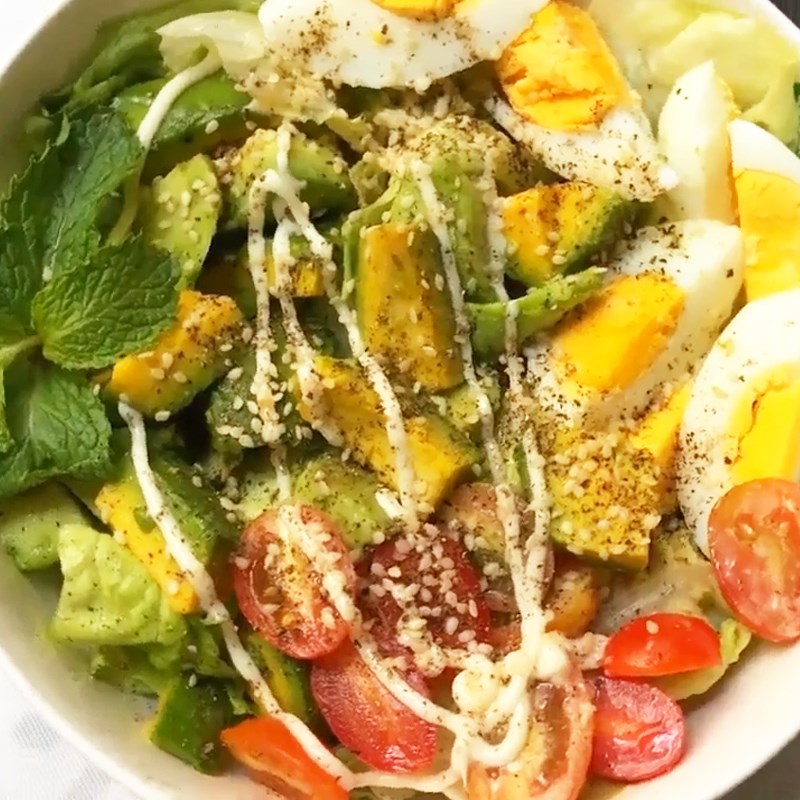 Tiếp tục cho vào tô phần bơ và trứng, đảo nhẹ nhàng để bơ và trứng không bị nát. Sau đó cho thêm vào 1 ít mè rang, tiêu xay và trang trí bằng nhánh lá bạc hà cho thơm và đẹp mắt là hoàn thành.