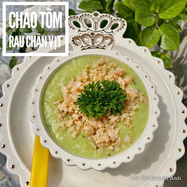 Nguyên liệu: Cháo trắng, tôm, rau chân vịt, phô mai.