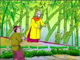 Nó làm theo y lời dặn, ông dạy nó đọc: "Khắc nhập, khắc nhập" (vào ngay, vào ngay) đủ ba lần, thì một trăm khúc tre tự nhiên dính lại với nhau thành một cây trẻ đủ một trăm mắt. Nó mừng quá, định vác về, nhưng cây tre dài quá, vướng không đi được. Ông lão bảo nó đọc: "Khắc xuất, khắc xuất" (ra ngay, ra ngay) đúng ba lần thì cây tre trăm mắt lại rời ra ngay từng khúc.