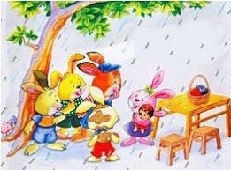 Hôm nay, gia đình Thỏ dọn đến nhà mới. Bố mẹ Thỏ đã chuyển được nhiều đồ đạc đi rồi, chỉ còn lại một cái bàn, hai cái ghế và cái giỏ khâu của mẹ thôi. Năm anh em Thỏ bàn nhau chuyển nốt chỗ bàn ghế ấy đến nhà mới đỡ cho bố mẹ. Anh Thỏ Khoang lớn nhất đứng ra phân công cho các em tùy theo sức của mỗi ngừơi. Thỏ khoang nói: – Anh và Thỏ Nâu khỏe nhất thì khiêng cái bàn. Thỏ Xám và Thỏ Đen mỗi em mang một chiếc ghế. Còn em Thỏ Trắng bé nhất nhà, em sẽ mang cái giỏ khâu của mẹ và bế búp bê đi theo. Năm anh em vui vẻ làm việc, vừa làm vừa hát quên cả mệt.. Trời bỗng đổ cơn mưa. Anh em Thỏ đang đi phải đứng lại đặt bàn ghế xuống rồi đứng trú vào gốc cây. Trời cứ mưa mãi không tạnh, ai cũng muốn về vì biết bố mẹ đang mong. Anh em Thỏ bàn nhau cứ đi tiếp, nhưng đi thì mưa ướt mất, về bị ốm thì sao? Mỗi người một ý, cuối cùng em Thỏ Trắng nêu ý kiến và được các anh hoan hô. Theo lời Thỏ Trắng, các anh xếp ghế lên mặt bàn, rồi nấp ở dưới, mỗi người khiêng một chân bàn. Còn Thỏ Trắng xách giỏ khâu của mẹ và bế búp bê đi ở giữa. Thế là anh em Thỏ về đến tận nhà mới mà không ai bị ướt, cả giỏ khâu và em búp bê cũng thế. Bố mẹ Thỏ chạy ra đón và khen các con vừa giỏi vừa ngoan.