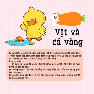 Bầy vịt đáp: - Cứ nằm đợi đấy đi, để tụi tui đi kiếm ăn một lát rồi chiều sẽ đem nước về cho cá bơi.